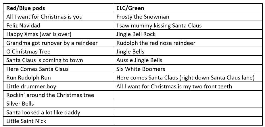 Lyric sheets to share across classrooms to maintain consistency: Santa Claus is Coming To Town and The Little Drummer Boy